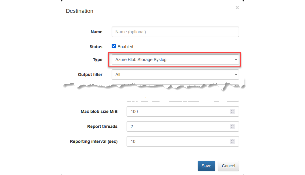 Use this output type to send NFO data to Azure Blob Storage account container. Logs may be in Syslog or JSON format. Logs are separated by a new line character. Blob may be uncompressed or GZIP compressed.