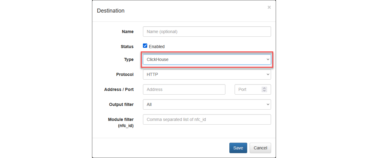 Use this output type to send NFO data to ClickHouse open-source column-oriented database. For more information, visit https://clickhouse.com/