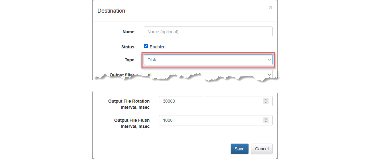 | Output File Rotation Interval, msec | Disk output file rotation interval. Min - 1000, max - 3600000, default - 30000 |