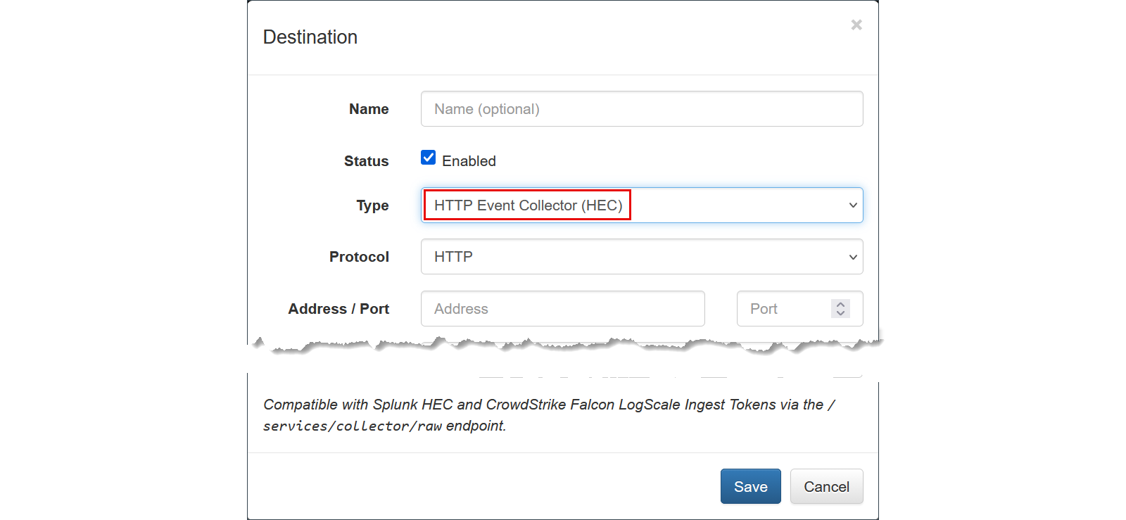 | Address | The destination IP address or Hostname of the analytics platform (e.g., splunk-server.example.com or cloud.community.humio.com). |