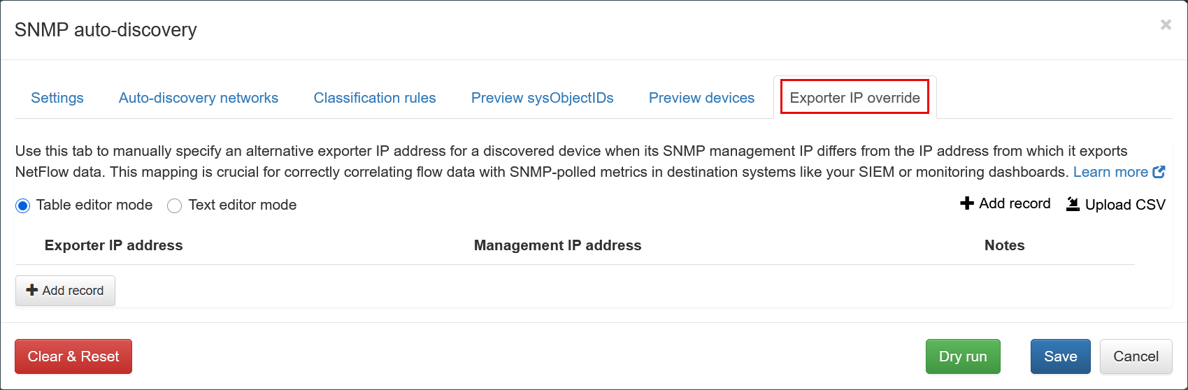Use this tab to manually specify an alternative exporter IP address for a discovered device when its SNMP management IP differs from the IP address from which it exports NetFlow data. This mapping is crucial for correctly correlating flow data with SNMP-polled metrics in destination systems like your SIEM or monitoring dashboards.