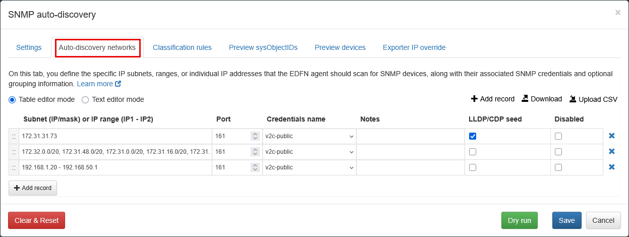 On this tab, you define the specific IP subnets, ranges, or individual IP addresses that the EDFN agent should scan for SNMP devices, along with their associated SNMP credentials and optional grouping information.