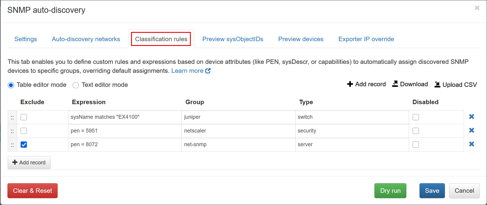 In most cases, you do not need to configure anything on this tab. The EDFN agent includes a comprehensive set of built-in Classifiers that automatically identify and assign the correct Group and Type for the vast majority of networking hardware (Cisco, Juniper, Palo Alto, Arista, etc.).