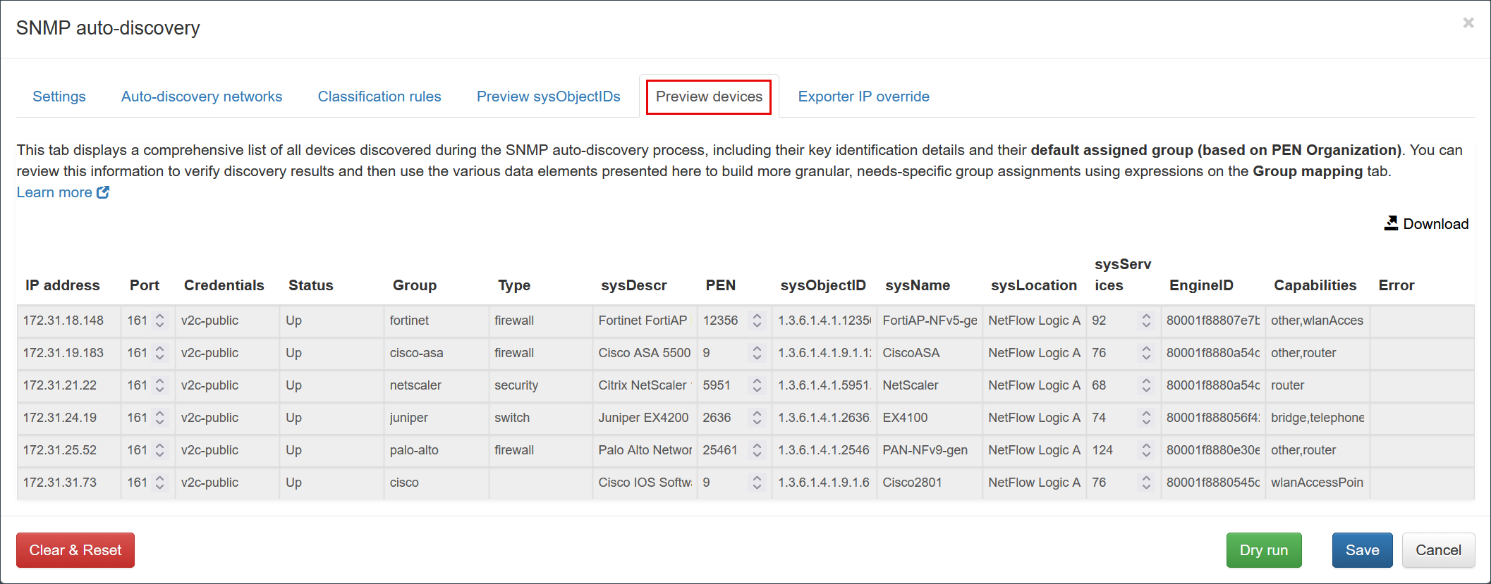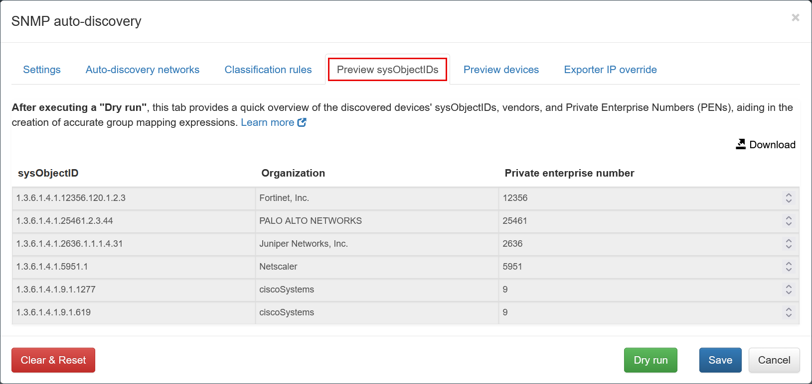 After executing a "Dry run", this tab provides a quick overview of the discovered devices' sysObjectIDs, vendors, and Private Enterprise Numbers (PENs), aiding in the creation of accurate mapping expressions on the Classification rules tab.