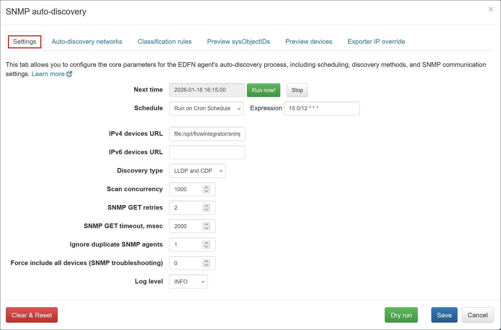 This tab allows you to configure the core parameters for the EDFN agent's auto-discovery process, including scheduling, discovery methods, and SNMP communication settings. On this screen, you can configure the following parameters, and use the Dry run button to simulate the discovery process without saving changes, the Clear & Reset button to delete all current settings, the Save button to apply your configurations, or the Cancel button to discard changes and return to the previous state.
