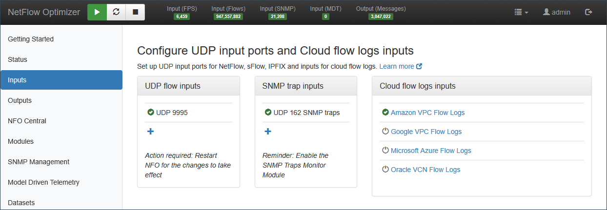 - Inputs (Sources): Where raw NetFlow enters the system (e.g., UDP 9995) or Cloud Flow logs.