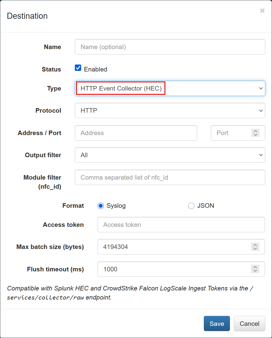 HTTPorHTTPS - Address: Enter your CrowdStrike LogScale HEC endpoint (e.g.,