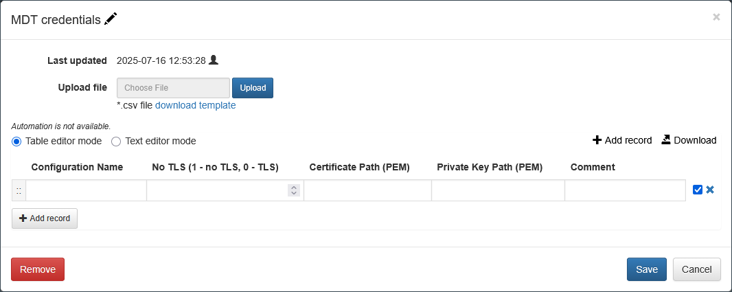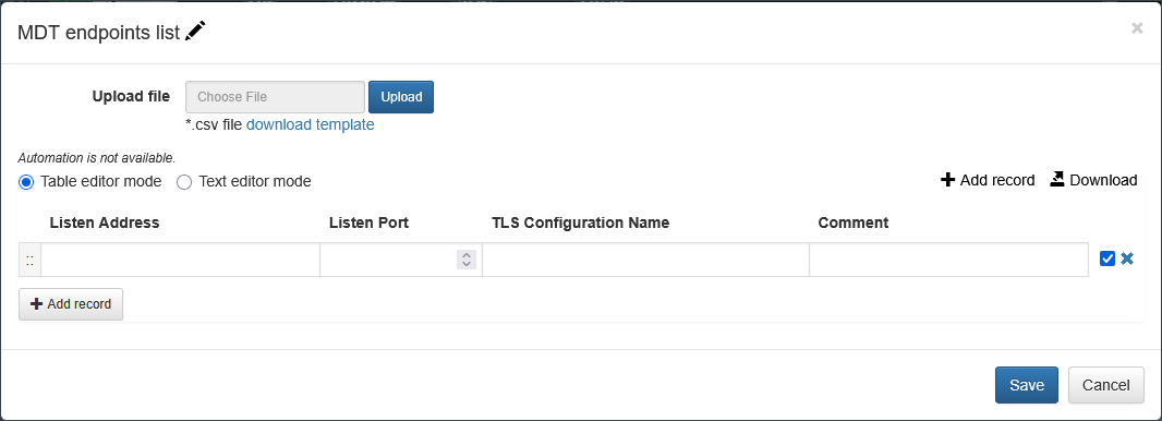 TLS Configuration Namein the MDT Endpoints list). - No TLS: Set to 0 if TLS security is enabled. Set to 1 for insecure connections (not recommended for production environments).