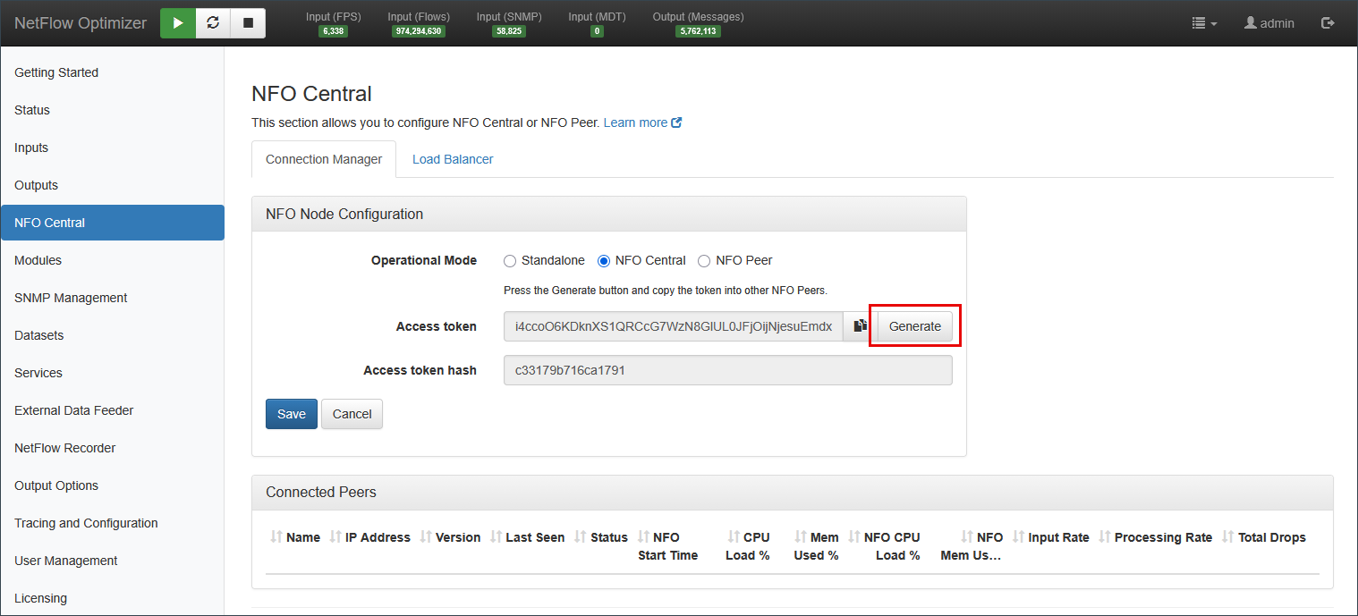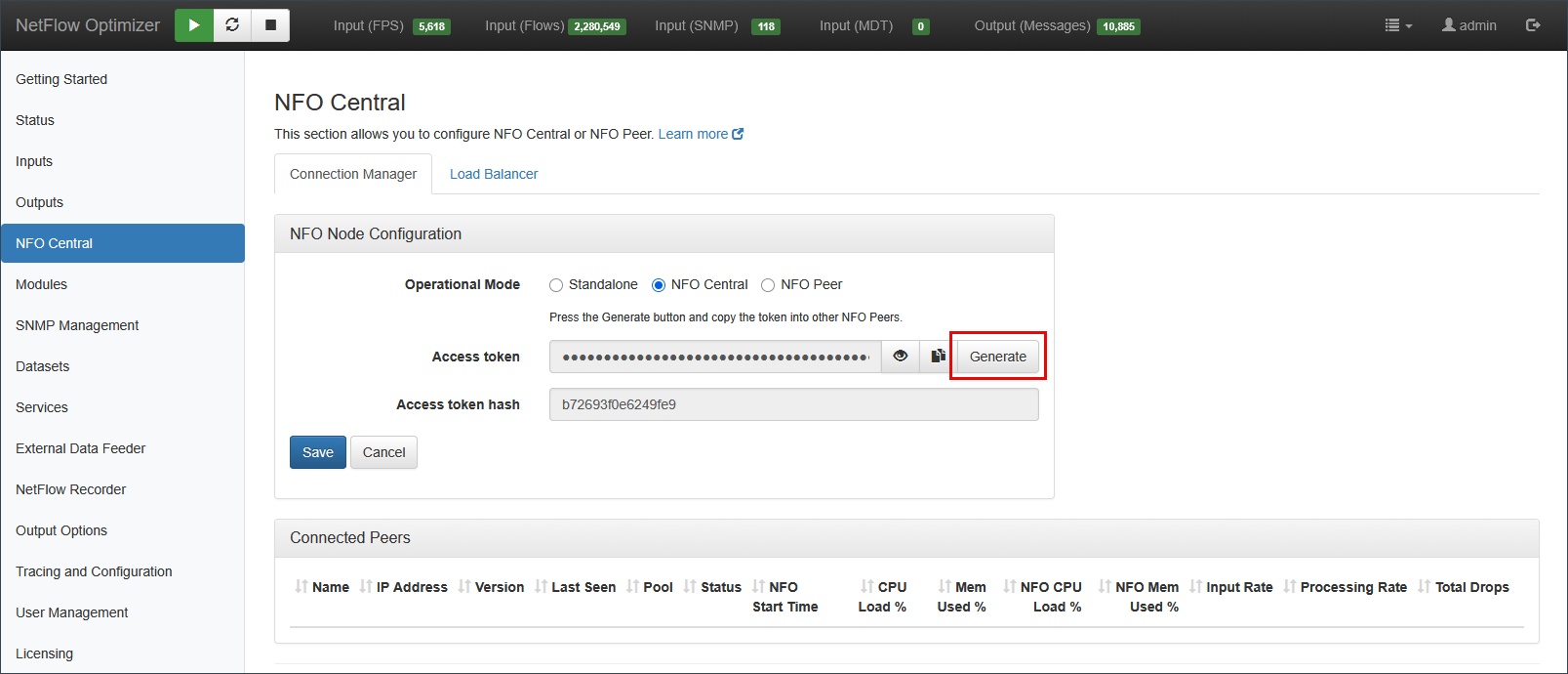 - Access Token: A token generated by NFO Central that NFO Peers use to authenticate their connection. Press the Generate button to create a new token.
