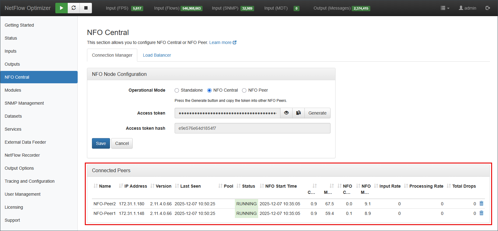 https://<host>:8443). - Access Token: The access token generated by the NFO Central instance, used by the peer to authenticate its connection.