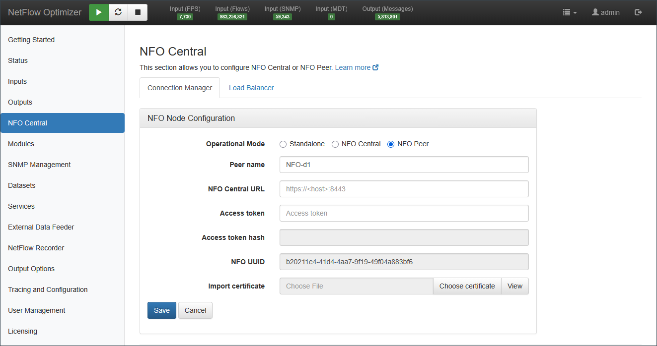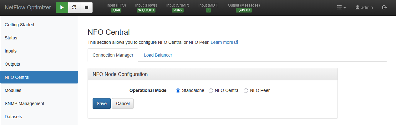 The NFO Central section is the central configuration hub for managing distributed NetFlow Optimizer deployments. It allows you to define a node's operational role and manage the connection and intelligent load distribution across multiple NFO instances.