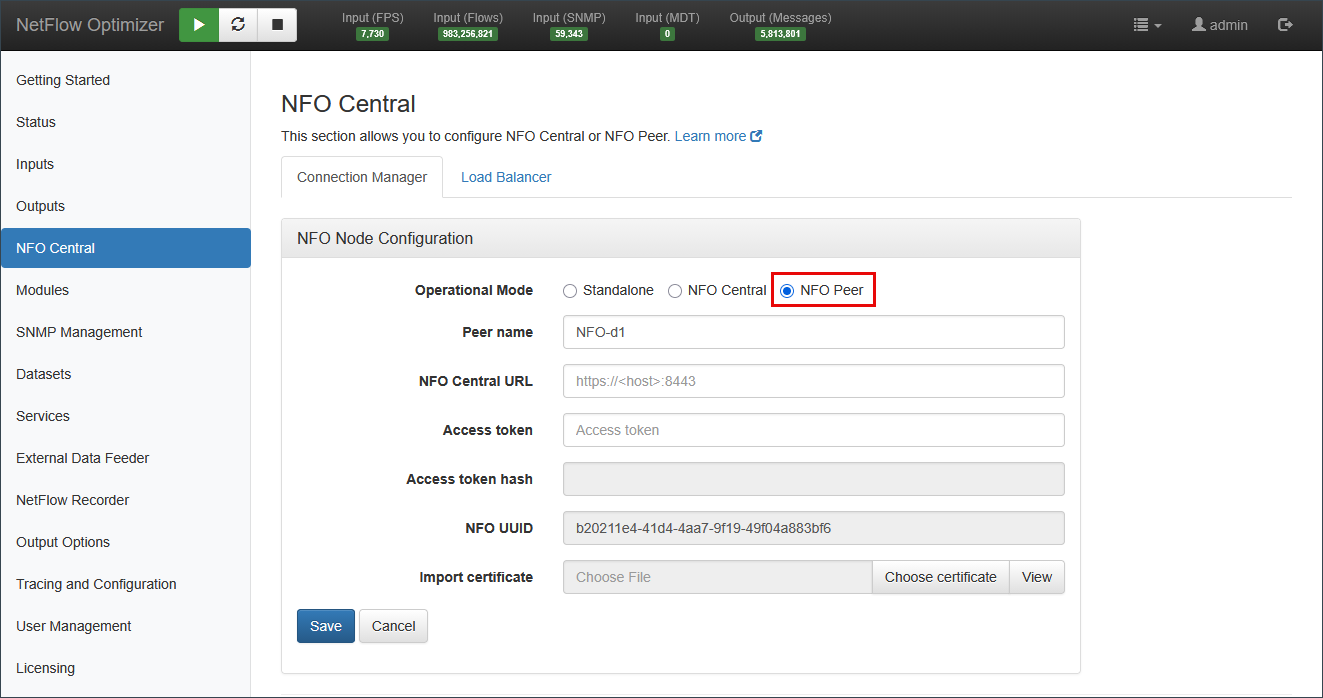 The NFO Central is the central configuration hub for managing distributed NetFlow Optimizer deployments. It allows you to define a node's operational role and manage the connection and intelligent load distribution across multiple NFO instances.