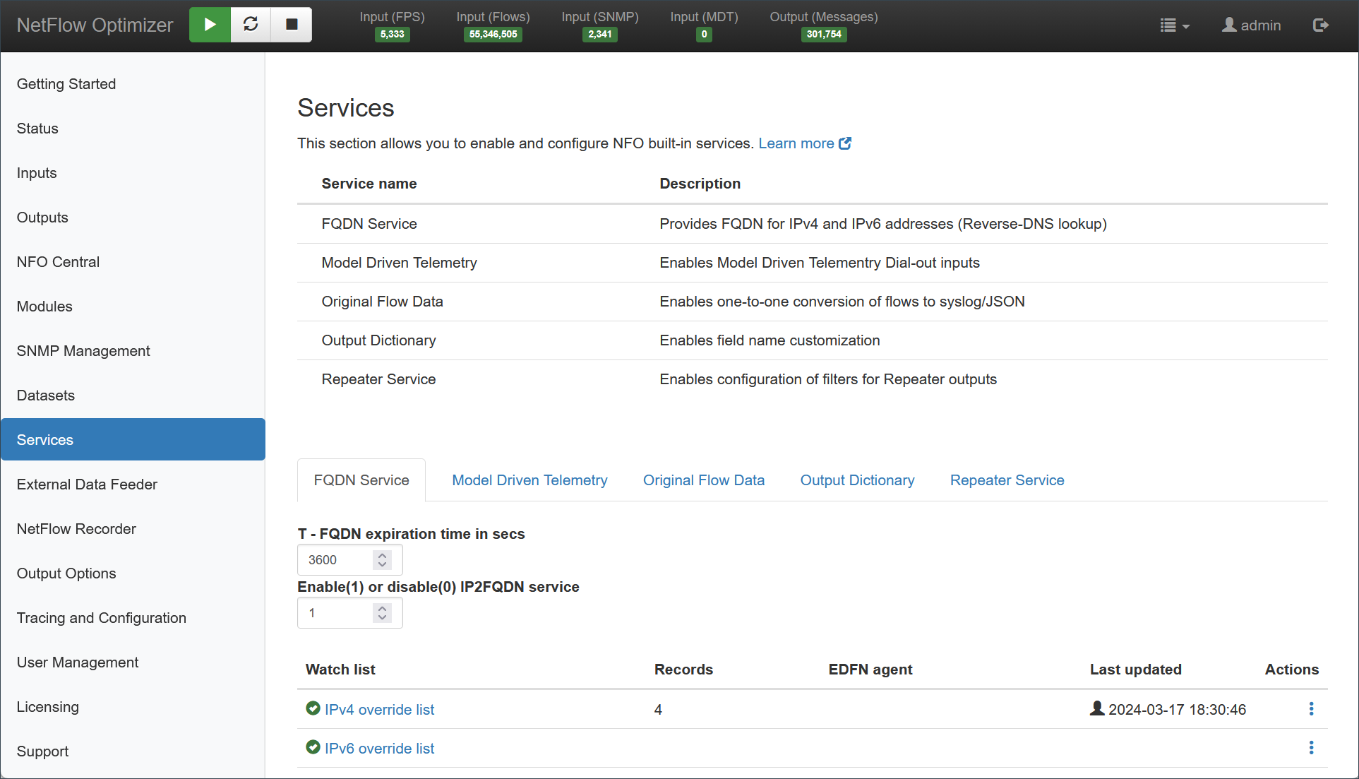 | Repeater Service | Enables advanced filtering for retransmitted flow data (repeater outputs). |