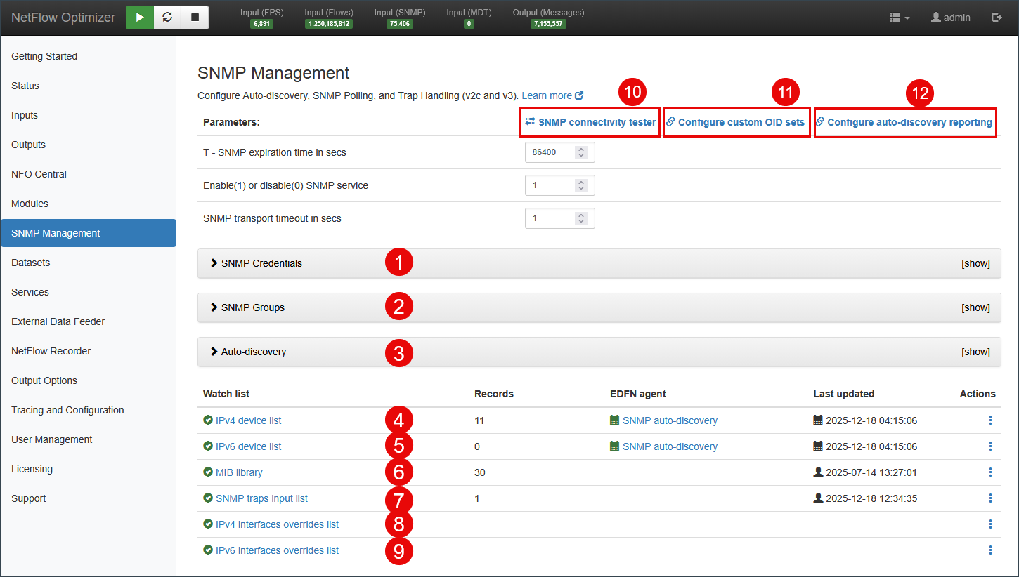 - SNMP traps input list: SNMP Trap ports and credentials