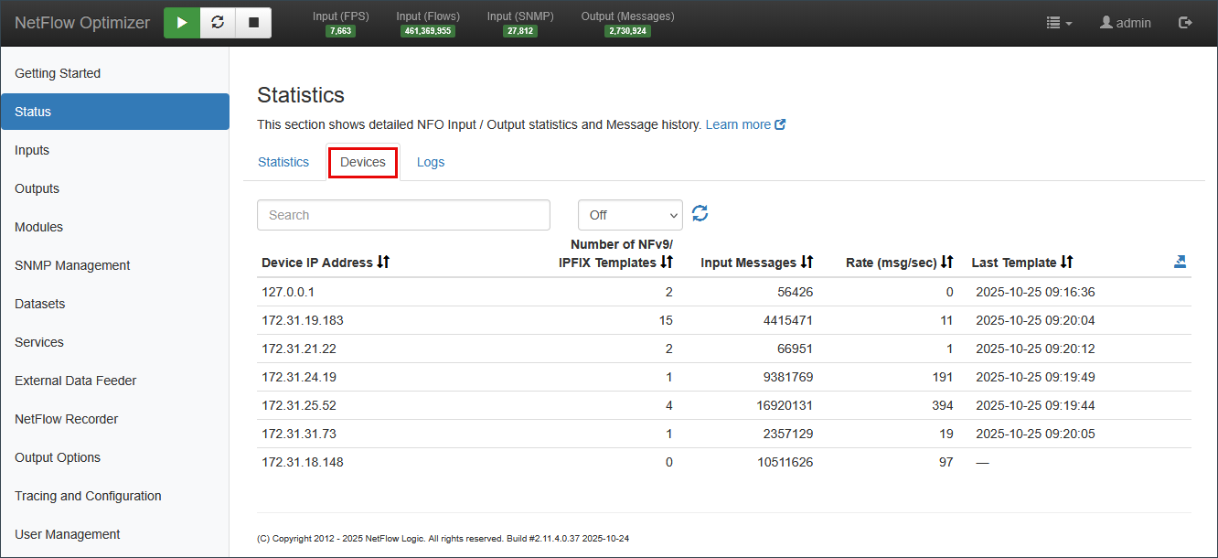 Devices tab displays a list of NetFlow exporters, along with statistics including the total number of messages received and the current message rate (messages per second), as well as NetFlow/IPFIX template information.