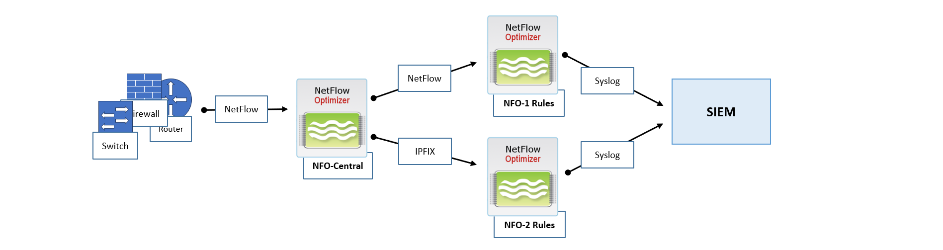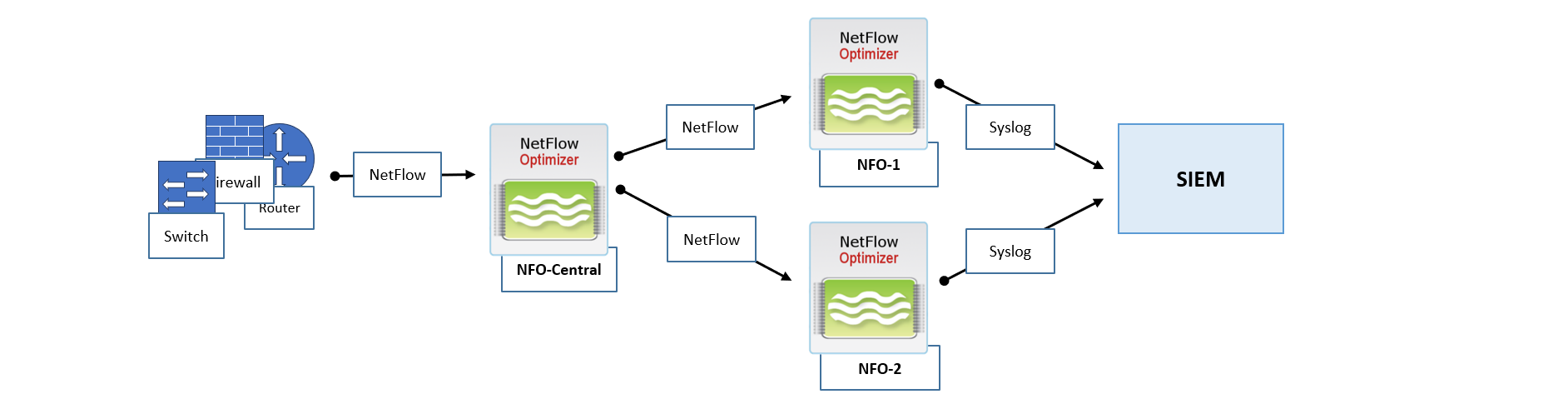 - Centralized Output: Both NFO-1 and NFO-2 are configured to send their processed output data to the same central SIEM or analytics platform.