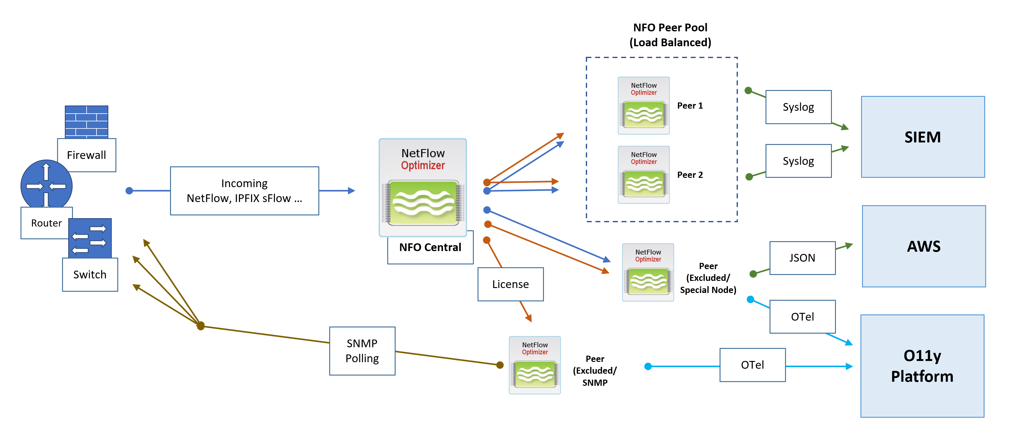 - NFO Peer Pool (Load Balanced): A cluster of NFO Peer Nodes designated to receive and process the intelligently distributed NetFlow workload.