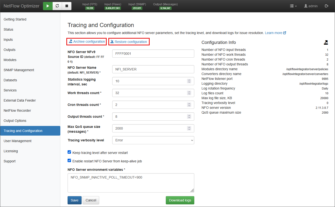 NFO logs its activity in $NFO_HOME/logs (NFO_HOME default is /opt/flowintegrator). You can also see their health on the Status page. This page shows input / output statistics, length of various queues, and drop counts.
